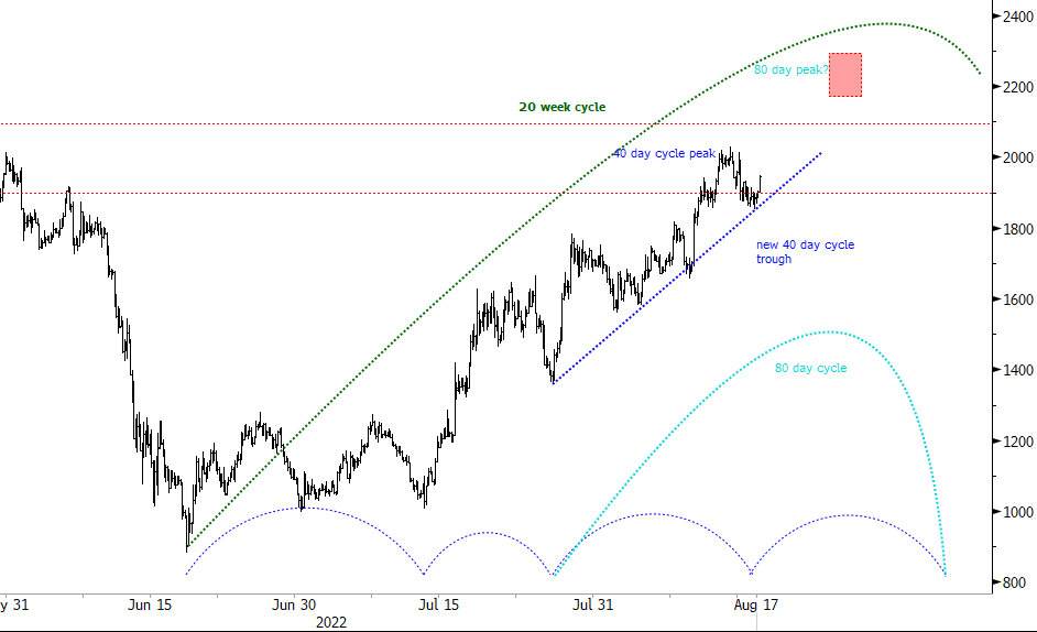 More importantly perhaps is the 20-week cycle which will still be rising at the end of the month as the 80-day cycle starts to top. The 20-week cycle is the tailwind to the advance and is bullish. This should mute any downswings for now. The prognosis then is keep looking up for now ahead of navigating a pause zone in the next few weeks.