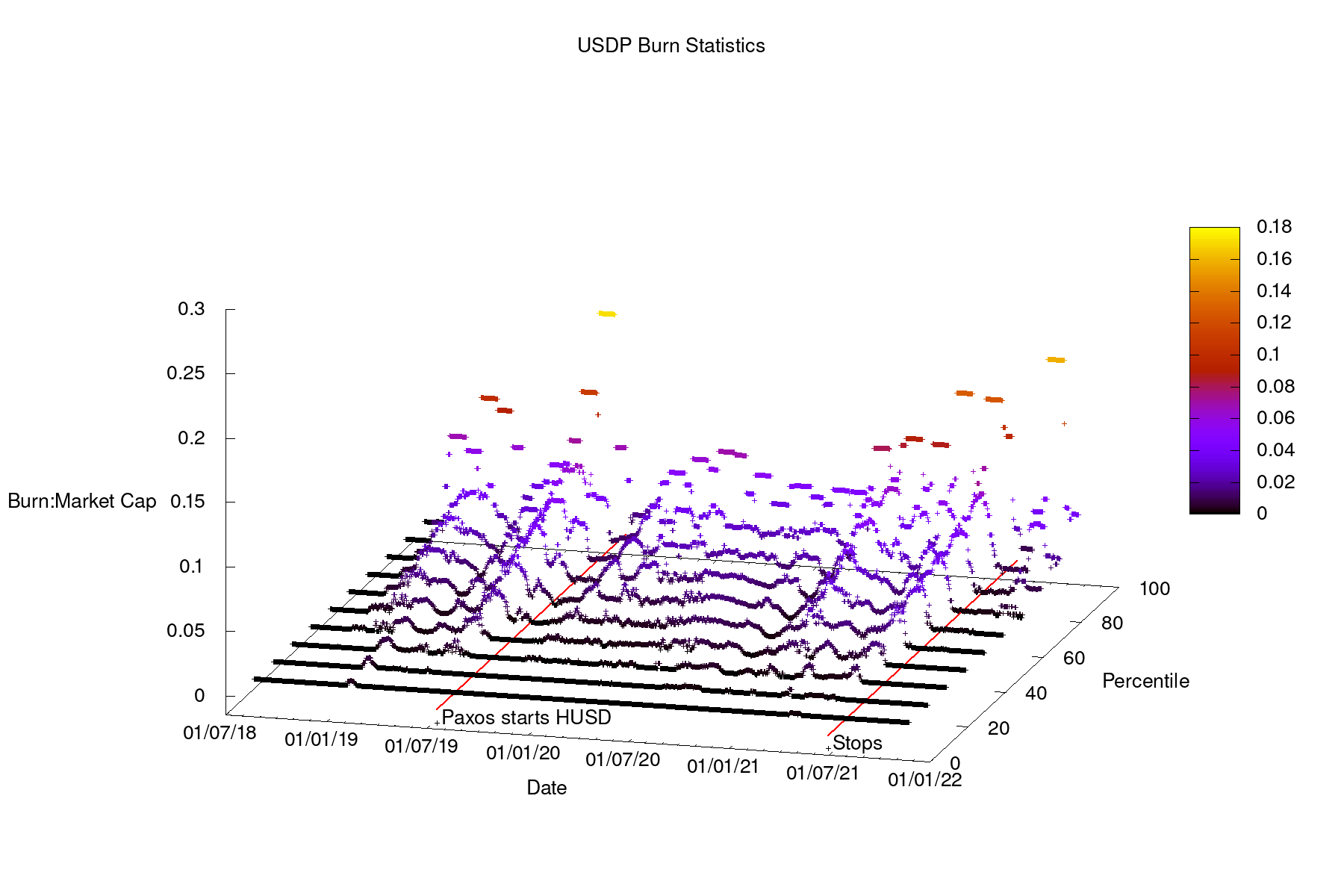 This is odd. What kind of stablecoin routinely burns >5% of the supply in a single day? And why were we routinely seeing velocity numbers like 12 (3% daily is 30 days or 12x per year) which then dropped to the expected 1-2 range (0.25% is 400 days turnover)?