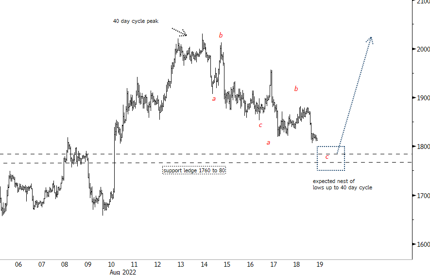 Not only are we close to a decent cycle low area, price is also closing in on a support ledge between US$1,760 and US$1,780. This ledge served as resistance at the end of July and pushed back a failed upside break on 8 August. It has some authority. The price action down from the 18 August top, which was the 40-day cycle peak is clearly corrective. I have labelled it a double abc zigzag.