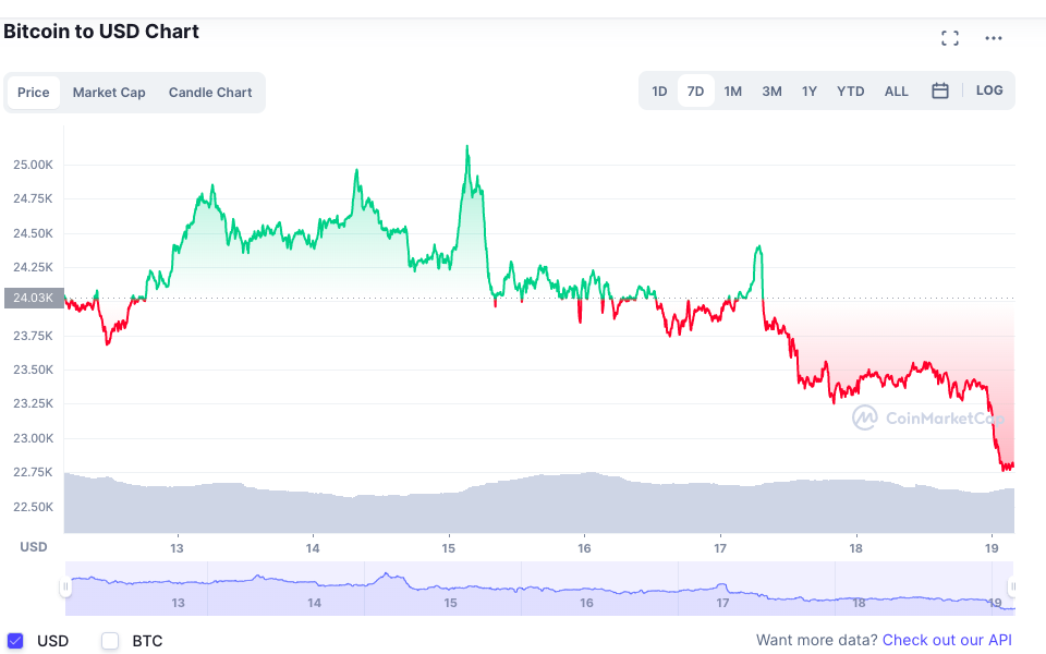 Last week, BTC reached a two month high of US$25,000 after the release of the US CPI data, which showed a slower-than-expected reading, raising hopes that inflation would decelerate. At the time of writing, Bitcoin (BTC) is trading at US$22,798.15 (-2.87%)