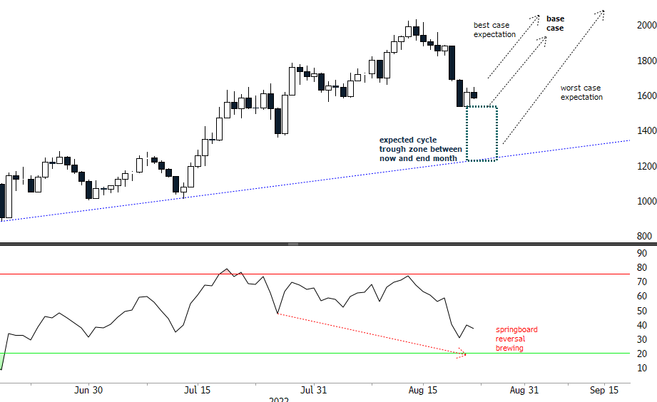 The best case scenario for an upside reversal has been and gone. Base case now is for an imminent rally. Worst case is for a hard test right down into the uptrend support line from June. Either way, we are waiting to go long and keeping our powder dry. The worst case with the deepest pullback means wait