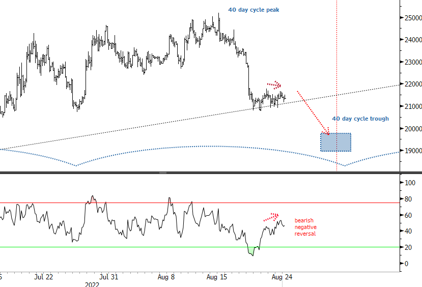 A few supporting pieces of evidence for “down for rest of month” thesis are as follows: the next higher cycle, the 80-day is also heading down and acting as a tailwind. Price is currently creeping along a trend “support” line in a choppy manner, characteristic of a correction. This chop having started straight out of a very sharp down move looks like wave 4 of 5 down in the structure from the 15 August top. A negative reversal has just posted in RSI – as a reminder, this is where RSI powers up and yet price does not follow. Poor ease of movement to the upside is a bearish indication.