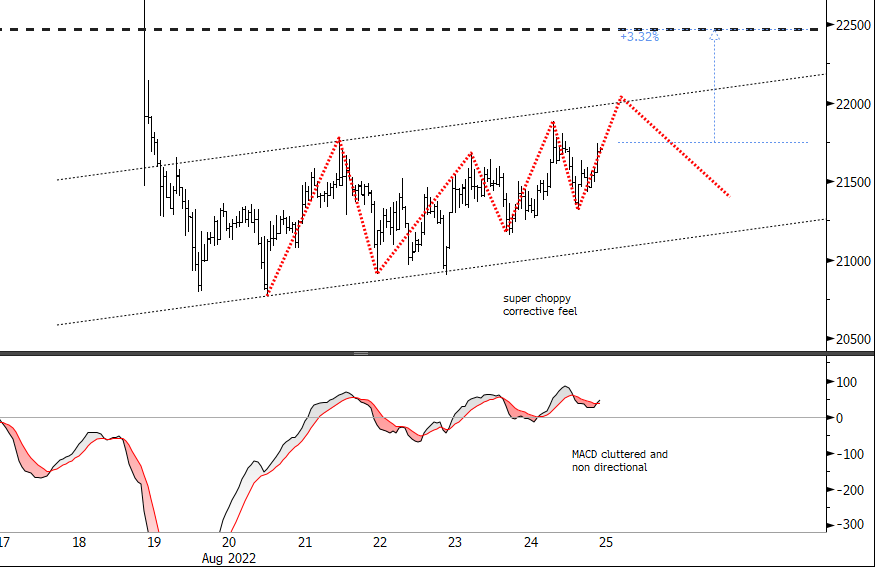 The advance has been extremely choppy and all of that overlap speaks to a corrective structure rather than a non-overlapping impulsive advance with legs. I am not expecting price to reach this high, but US$22,400 (some 3% higher) marks the 4 August spike price low and is the bottom of a potential resistance band.