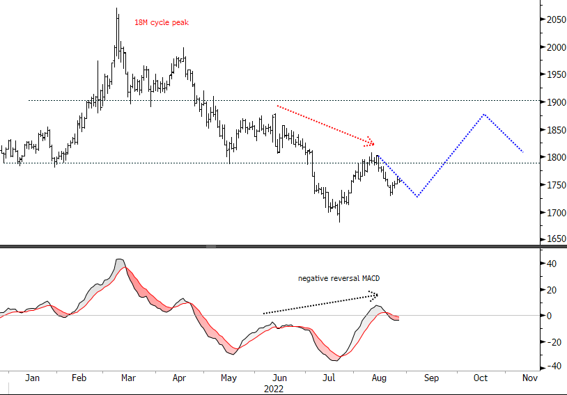 In cycles terms, gold has a very similar profile to Bitcoin – we are expecting a down continuation into an imminent 40-day cycle trough (early September). Note the failed upside break (second week August) and a negative reversal in MACD. Momentum rallied across the last cycle trough (21 July at US$1,681) but price didn’t follow up, which points to poor ease of movement to the upside and is near term bearish. Often these patterns occur towards to end of a decline. After the upcoming low, as for XBT, we are also expecting a rally and top out in October.