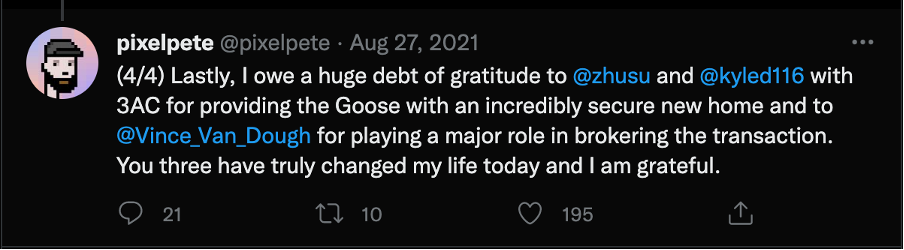 The seller in this transaction thanked the founders of 3AC and @Vince_Van_Dough (the broker, also SNC’s partner) after he profited approximately 1,798 ETH from the sale. It is truly unfathomable why 3AC would want to purchase this particular piece for such an unreasonably high price – especially if they could have stuck closer to floor prices or chosen others by the same artist. I am definitely intrigued why #879 stood out to them.
