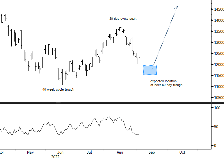 We are very close to an 80-day cycle low in Nasdaq and a rally should be imminent. Notice that the June low was significant, at least a 40-week cycle trough, which means the upward force of this big and relatively new cycle is still present and bullish. Get ready to reposition.