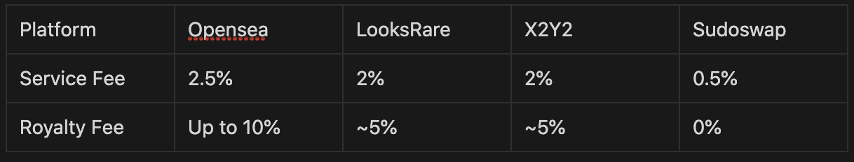 For both LooksRare and X2Y2, 100% of the service fee collected will be returned to their token stakers. Nonetheless, these fees are still considered relatively high and would impede traders’ profits.