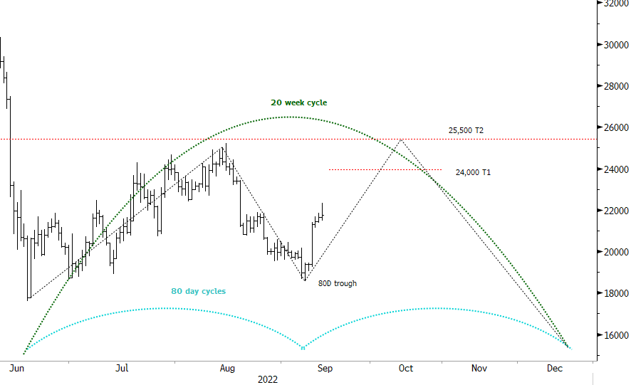 For now we are stalking the first upside target around US$24,000 and then US$25,500. This latter target, if reached, is not expected until early October.