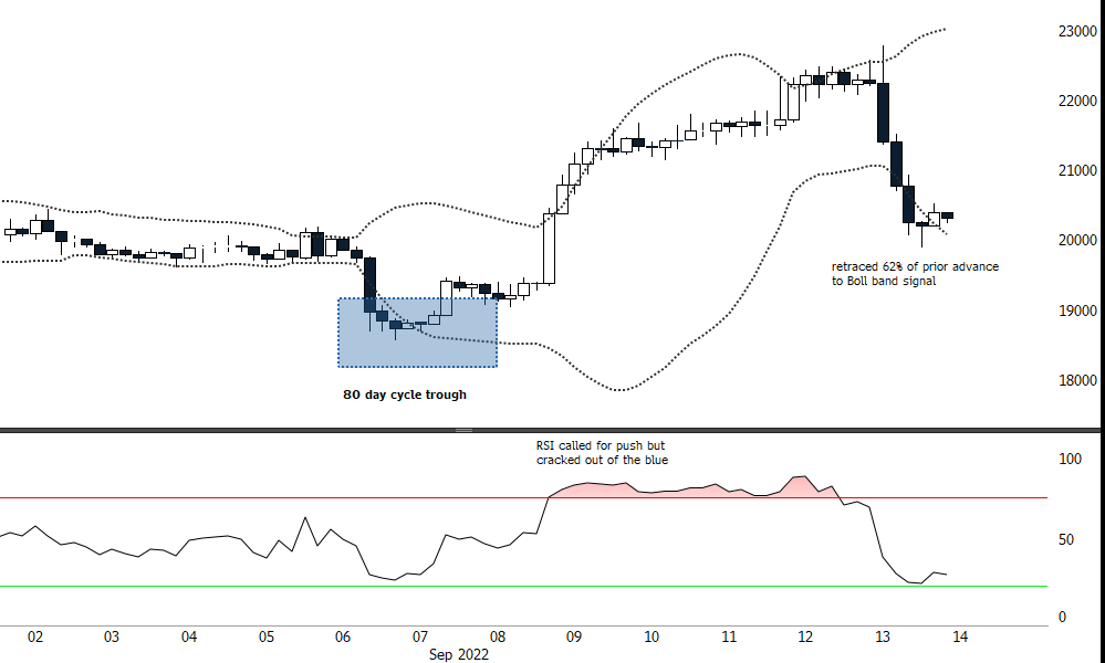 Backdrop for tumultuous crypto moves. A hot US CPI (inflation) print yesterday sent expectations of a 75 basis point rate hike to 60% in November and more dramatically perhaps the odds of 100 bps next week to 47%. Year-end rate hike expectations now represent the biggest jump in history. This served to push the dollar higher and smoked the markets, because the FED overdoing rate hikes to hit their 2% inflation target is seen as recessionary.
