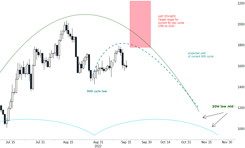 In the last ETH note I stated that the 80 day cycle low was in place, that it was countertrend (because 20 week cycle is falling and acting as a headwind) but nevertheless forecast that price should start reaching up into a target box between 1780 and 2220 before rolling over. Then came the hot CPI print and dollar rally which clubbed crypto and equity indices around the world and pushed the dollar into a hard upside reversal.