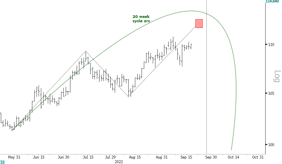 In cycles’ work, it’s typically the troughs that are most important, but in DXY for reasons too involved to go into in this note, it’s the peaks that have most impact. The daily chart highlights the 20-week cycle that has been running since the end of May. Price is currently powering up towards the 20-week cycle peak which is due at the end of this month and likely just sub-112. The price path is up and the next trough is due around mid-October.
