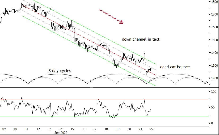We are still in the down channel and not even testing the bottom here. The preferred view is that this little move up is a so-called dead cat bounce and that it will be faded shortly for more downside resolution near term. Price is close to a longer term cycle low and we will focus in on that in tomorrow’s note.