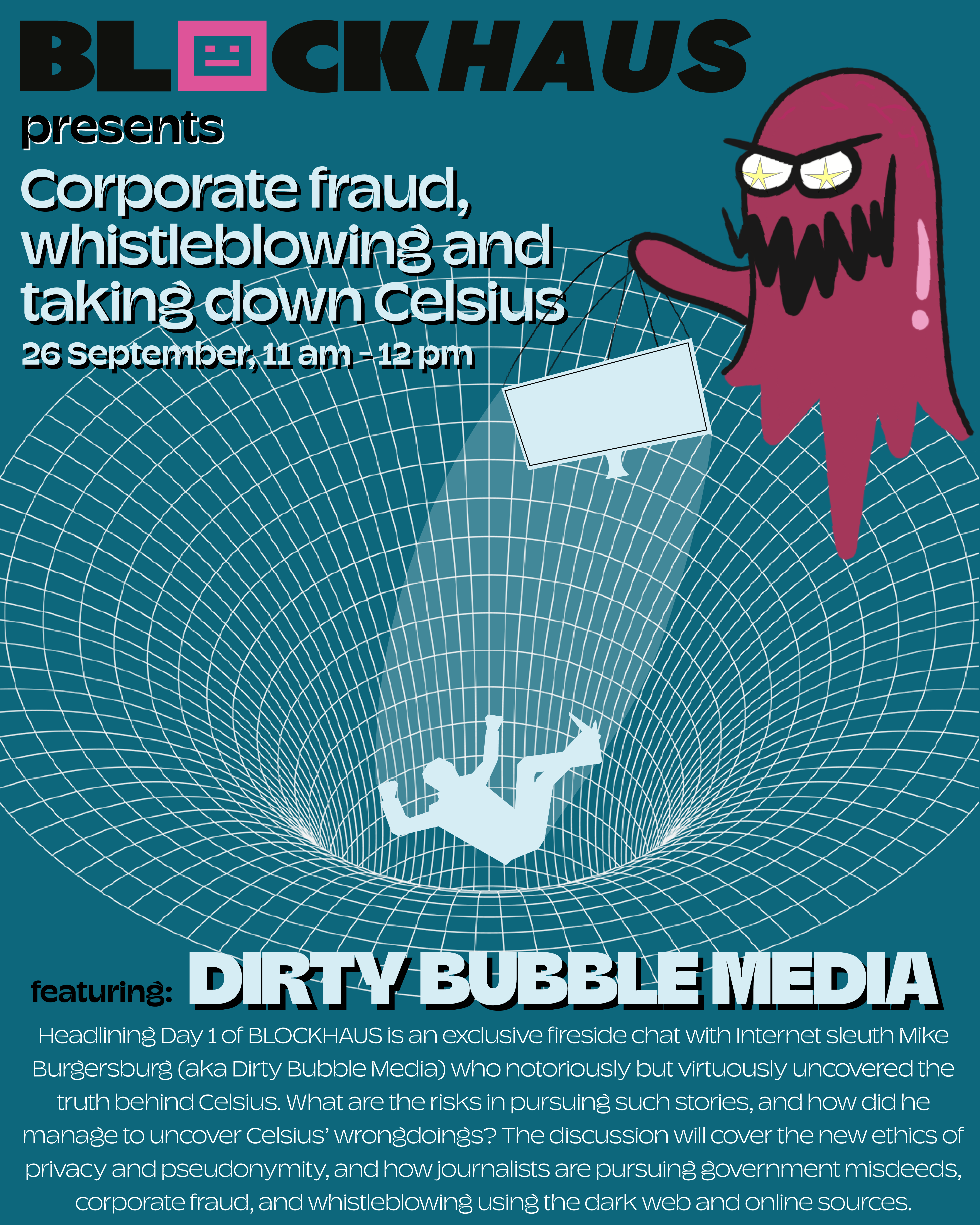 Headlining Day 1 of BLOCKHAUS is an exclusive fireside chat with Internet sleuth Mike Burgersburg (aka Dirty Bubble Media) who notoriously but virtuously uncovered the truth behind Celsius. Mike will discuss the risks in pursuing such stories, and how he managed to uncover Celsius’ wrongdoings, touching on the new ethics of privacy and pseudonymity, and how journalists are pursuing government misdeeds, corporate fraud, and whistleblowing using the dark web and online sources.