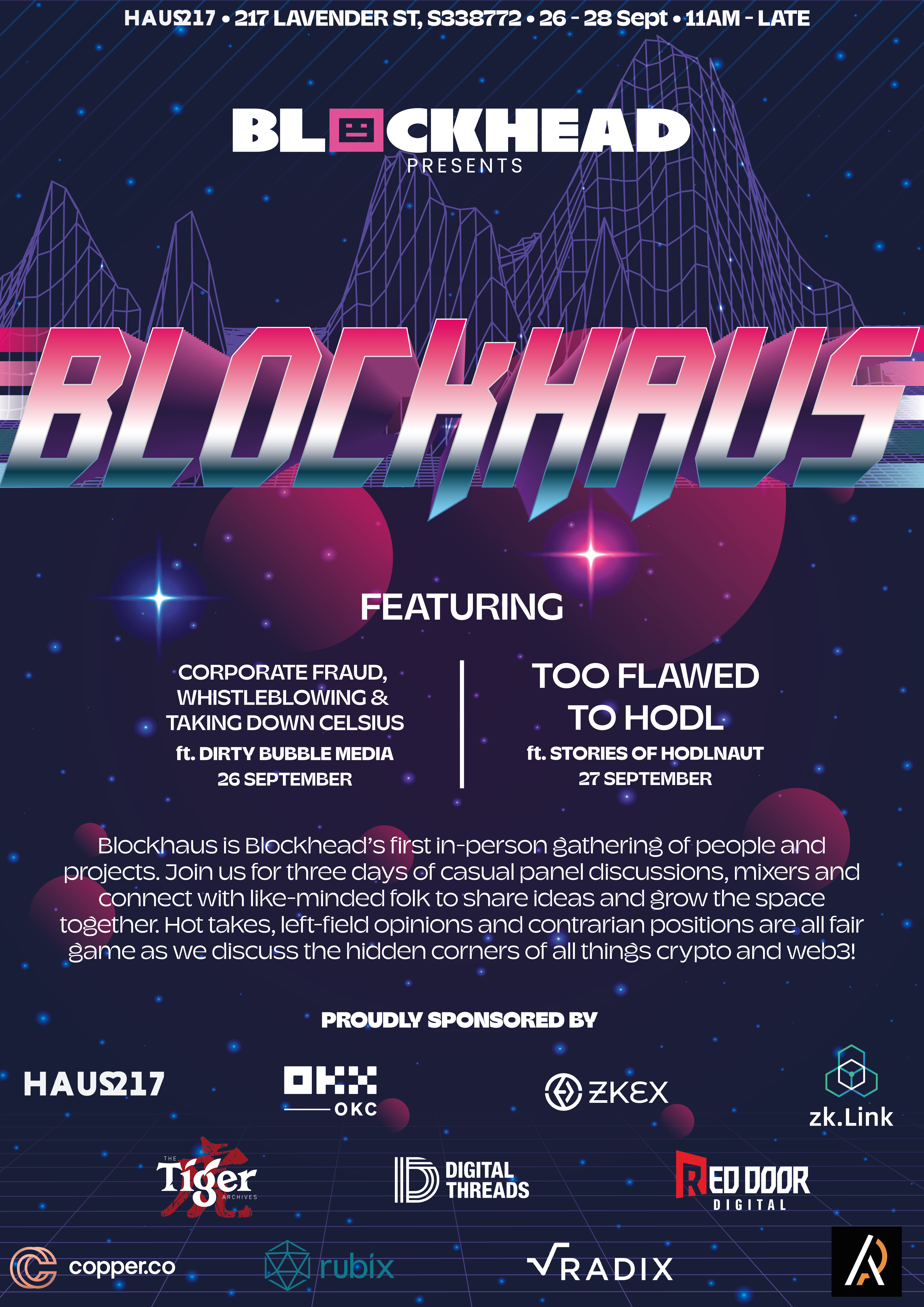 The BLOCKHAUS takeover of HAUS217 (217 Lavender St., Singapore 338772) – Blockhead’s first in-person gathering of people and projects – will play host to some of the most exciting alternative fireside chats and panels during Asia Crypto Week.
