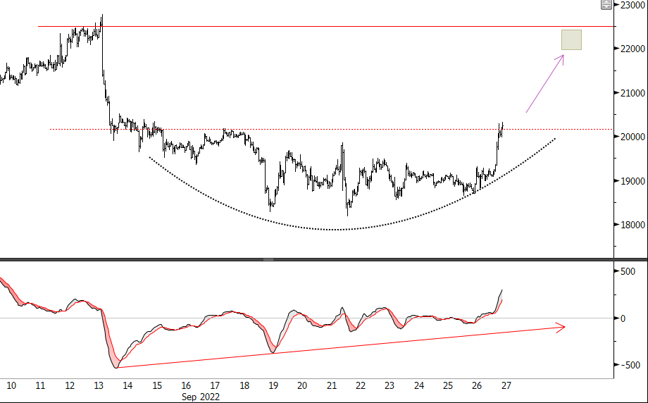 Today, I’ve got my eye on the Bitcoin hourly chart – price broke higher today, and as was anticipated in yesterday’s note, has formed a U-shaped base and is challenging the breakout level aggressively.