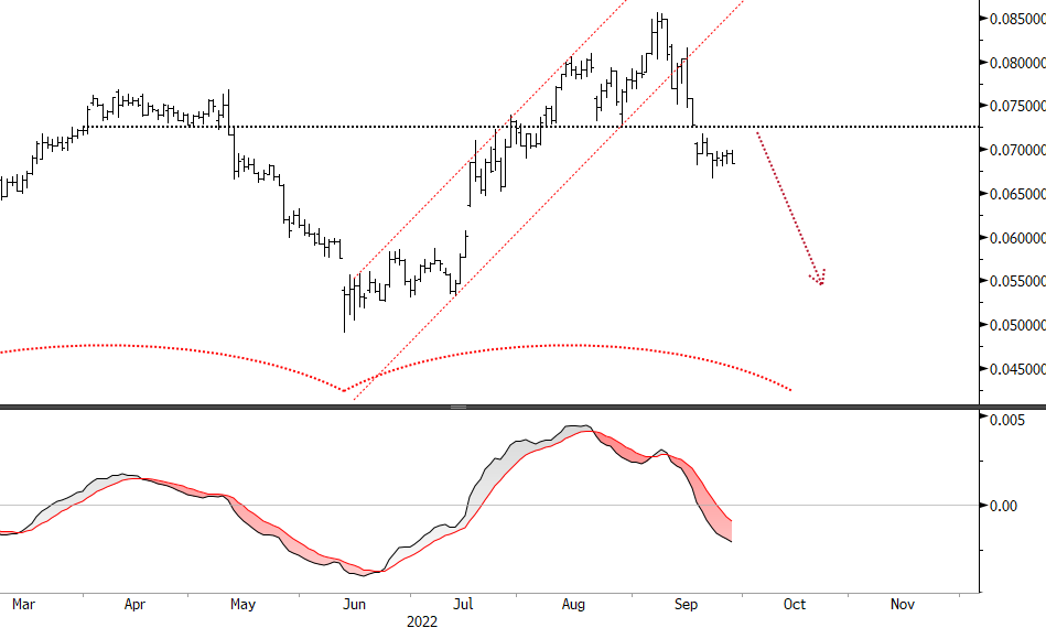 We haven’t looked at the Ethereum | Bitcoin spread for a while. In the last note on XETXBT in late August, we were stalking a top out in the June rally. Price pressed a little higher than expected, but on 9 September, it finally broke down. The June channel broke, then key support broke, then the MACD zero line broke all in fairly quick succession. Price is currently in a mini rest phase before heading down again, which strongly suggests that Ethereum underperforms Bitcoin near term.