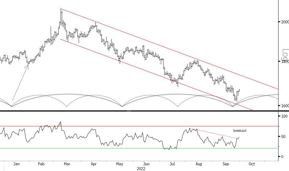 A hundred or so points higher is the top of the March downtrend channel, we call this the channel return line. This is where we see if a new grander uptrend is underway, ie. If price breaks out. You should, at the very minimum, expect a sharpish pullback here, but it is what happens after that that counts. Crypto has not quite caught up to the move in Gold yet but the preferred view remains for a near-term bottoming out and advance.