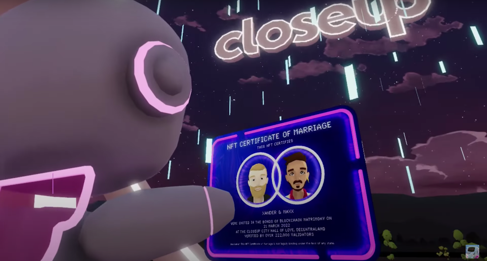 Wanting couples across the globe to break free from societal constraints around marriage, a Closeup City Hall of Love was built in Decentraland. At the City Hall, couples can mint NFT marriage certificates and make their union permanent on the blockchain.