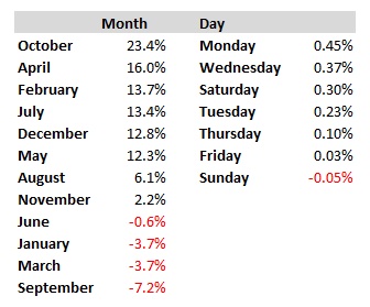 The table below shows open to close performance according to months of the year (and bear in mind we only have seven years for Bitcoin) and open to close performance for days of the week.. Just for fun and that…