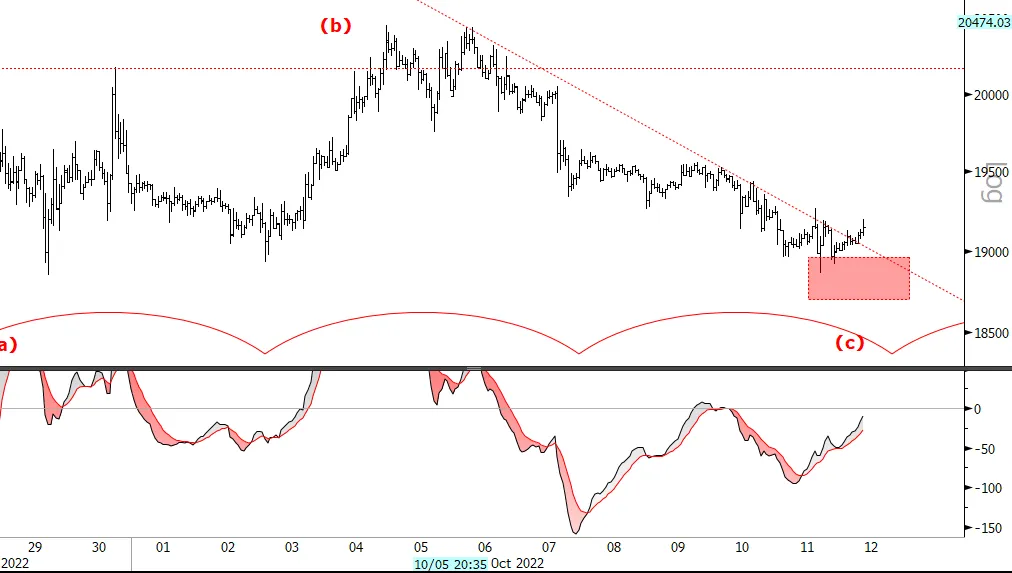 The expectation was for a C wave down into support between US$18,500 and US$18,800. Price has actually recovered near term and the most recent low was posted at US$18,861, which is higher than expectation and implies pent up bullish energy near term.