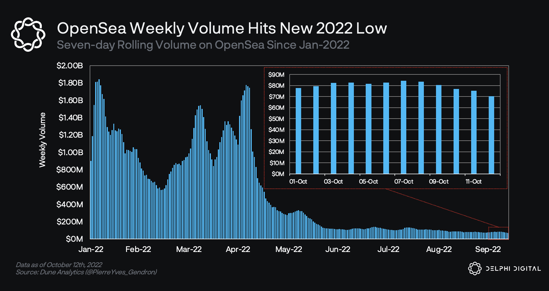 Misconceptions surrounding the NFT space understandbly come from looking at data from OpenSea. Earlier this week, daily trading volume on the platform hit a yearly low of US$6.2 million, with a weekly trading volume of just US$70 million. Search interest on Google for “NFT” also peaked in January 2022 and has declined steadily since.