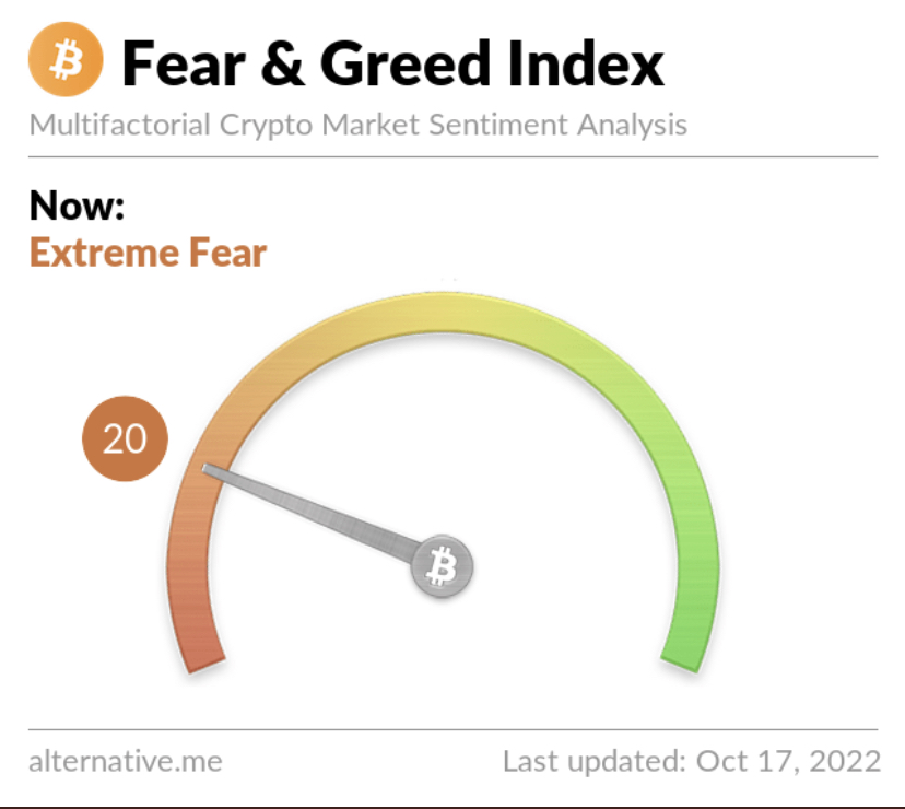 Risk appetites are sapped – the Crypto Fear and Greed Index currently stands at 20 indicating extreme fear. The index uses 5-6 measurements to assess the current sentiment of the market and then rates that level of emotion on a scale of 1-100 – 1 is extreme fear and 100 is extreme greed.