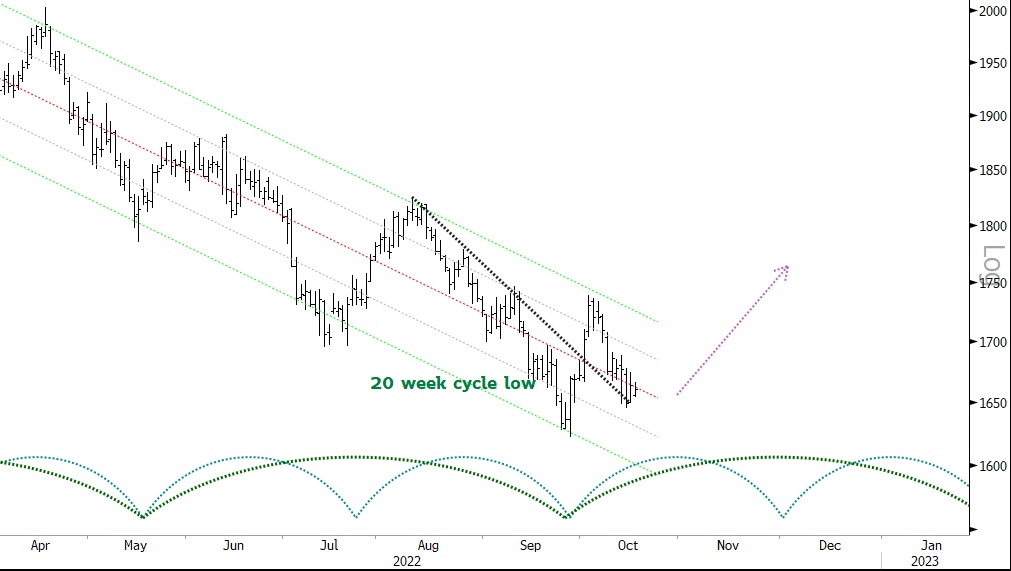 This is highly volatile action but price has now come back to an important level: a trend line retest and the middle of the regression channel. We are looking for the first 20-day cycle of the new 20-week cycle to bottom shortly and for price to start working its way higher.