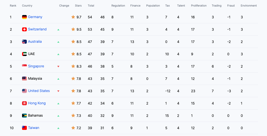 Coincub writes that “Singapore is a crypto powerhouse with a wide uptake of crypto investment among its population but has recently looked to constrain the third-party advertising of VASPS.” This could explain why the city-state dropped a point in the “regulation” category.