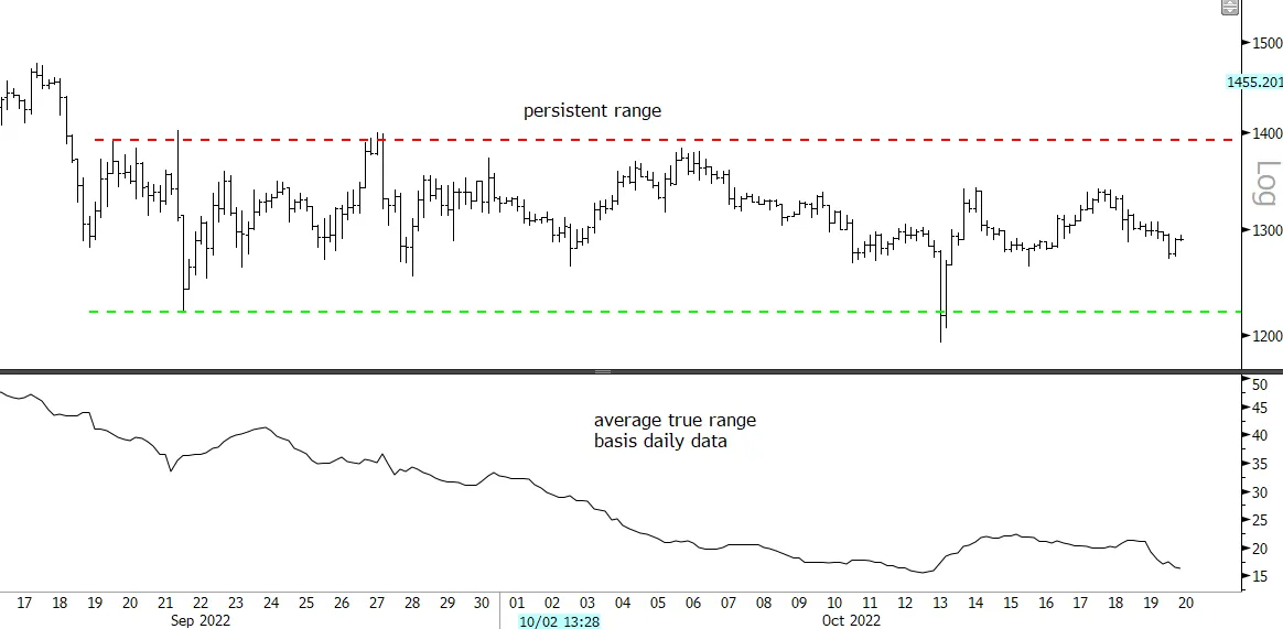 We are looking at Ethereum today basis 240-minute data. On this timeframe, it has been more or less untradeable since 19 September when it entered the long-range shown, so better to watch from sidelines until price breaks higher through US$1,400 and this becomes a support shelf for a move higher.. Or see a drop through US$1,200 and wait out the collapse.