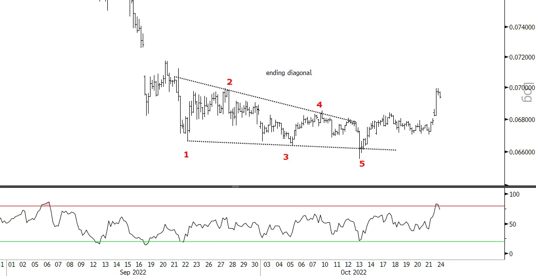 The chart shows the 240 minute level and the pattern into the 13 October low is called an ending diagonal.