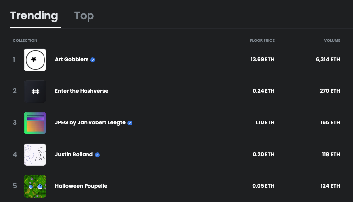 The 2,000 piece project, which was backed by web3 venture firm Paradigm, yielded 5,000 ETH in trading volume in its first two hours. At the time of writing, the project has hit 12,679.65 ETH in trading volume, with NFT prices reaching as high as 15 ETH with a current floor price of 13.69 ETH, positioning it at the top of OpenSea’s trending NFTs.