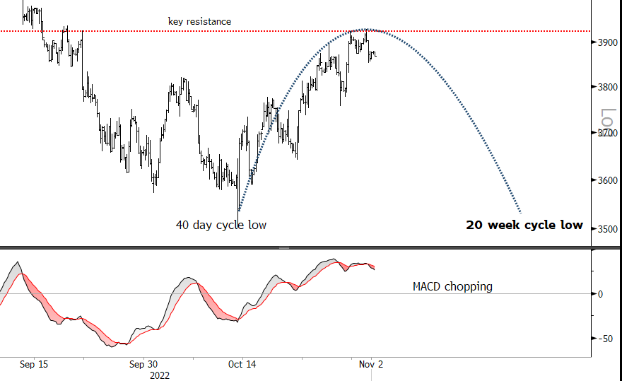 The next 20-week cycle low is due in a few weeks in my view. We can see how price just got pushed back hard at key resistance just above 3,900 and look how MACD is criss-crossing and diverging.. Price did not even attempt to break out.
