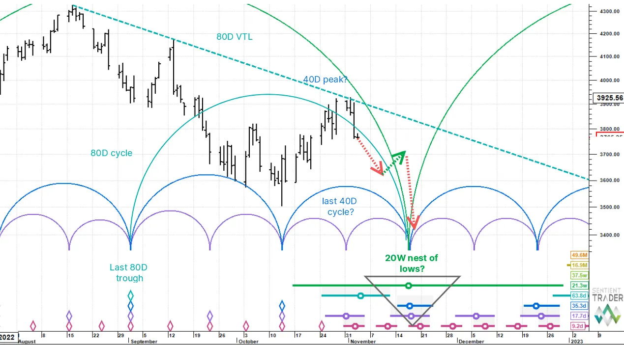 Green semi-circle is the 20 week cycle and its due to bottom around 20 November. Light blue semicircle 80 day cycle, dark blue one 40 day cycle. In cycles analysis 20 week cycle = 2 x 80 day; 80 day cycle = 2 x 40 day, and so on.