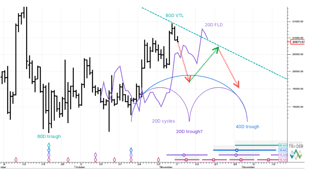 On this basis, it is too soon to say whether the 80 day cycle is heading down yet. Additionally, there was an 18 month cycle trough in June and this cycle is only 20 weeks old and is therefore still rising. Near-term, we are looking down for a cross of the 20 day FLD (forming limit diagrams), which generates a downside projection of circa US$19,500, due in the second week of November. After this we anticipate a rally.