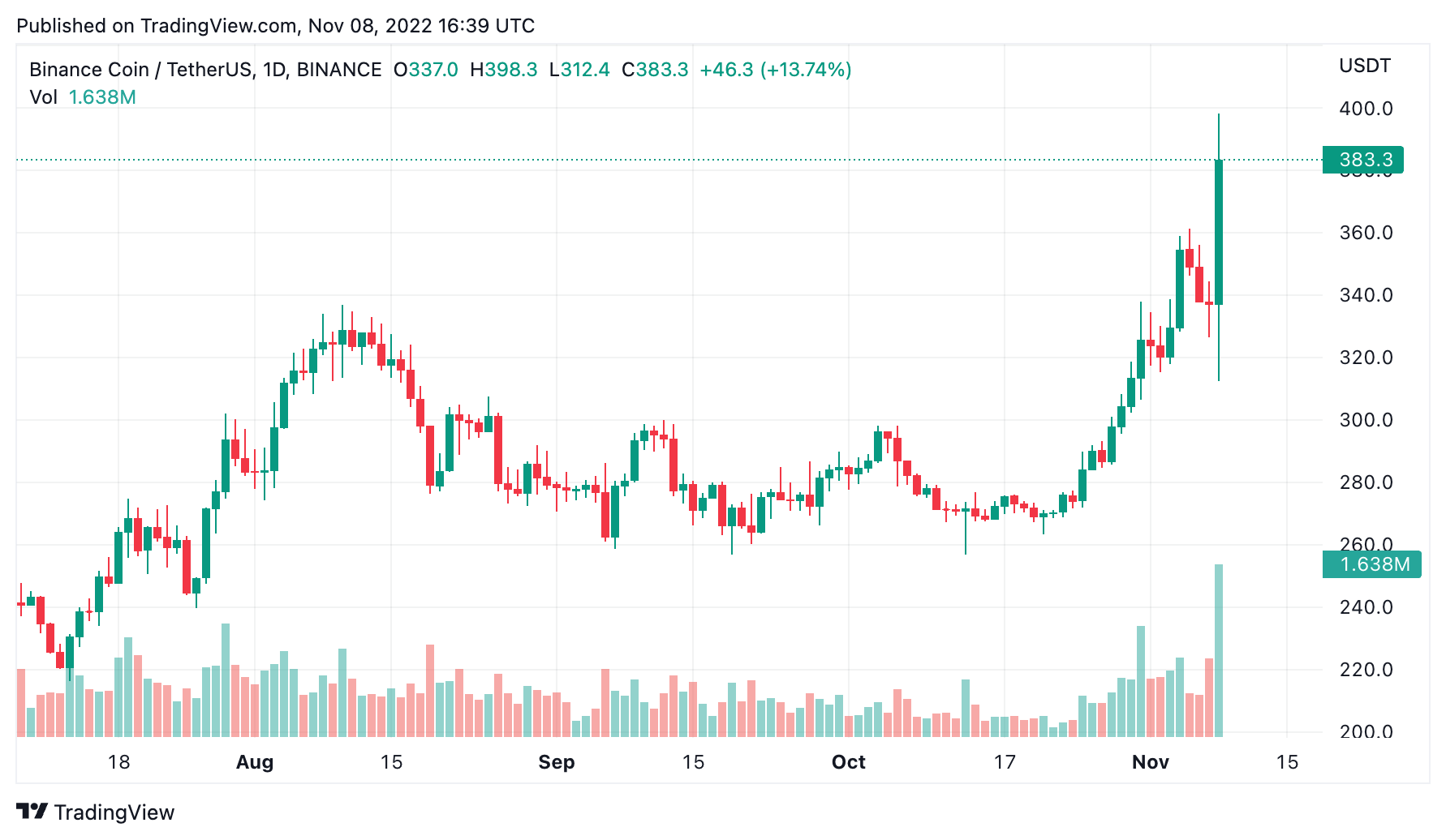 News of the impending takeover saw the BNB token almost immediately soar in price, from around US$325 before to US$387 at time of writing.