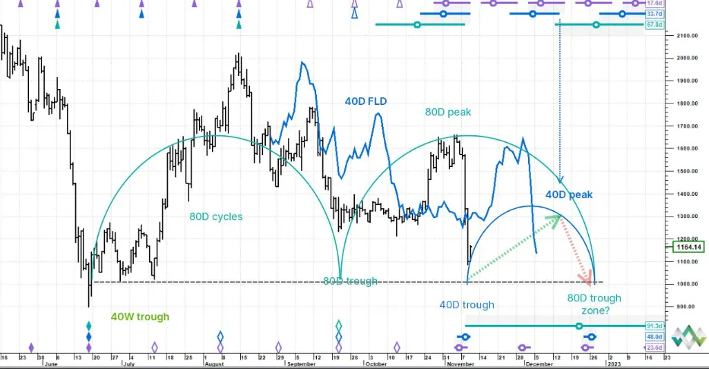 However, note that there is a decent shelf just above US$1,000, which could act as a near-term liquidity magnet 150 odd points lower. The 80-day cycle peak is now confirmed on 4 November and the next trough isn’t due until the third week of December.