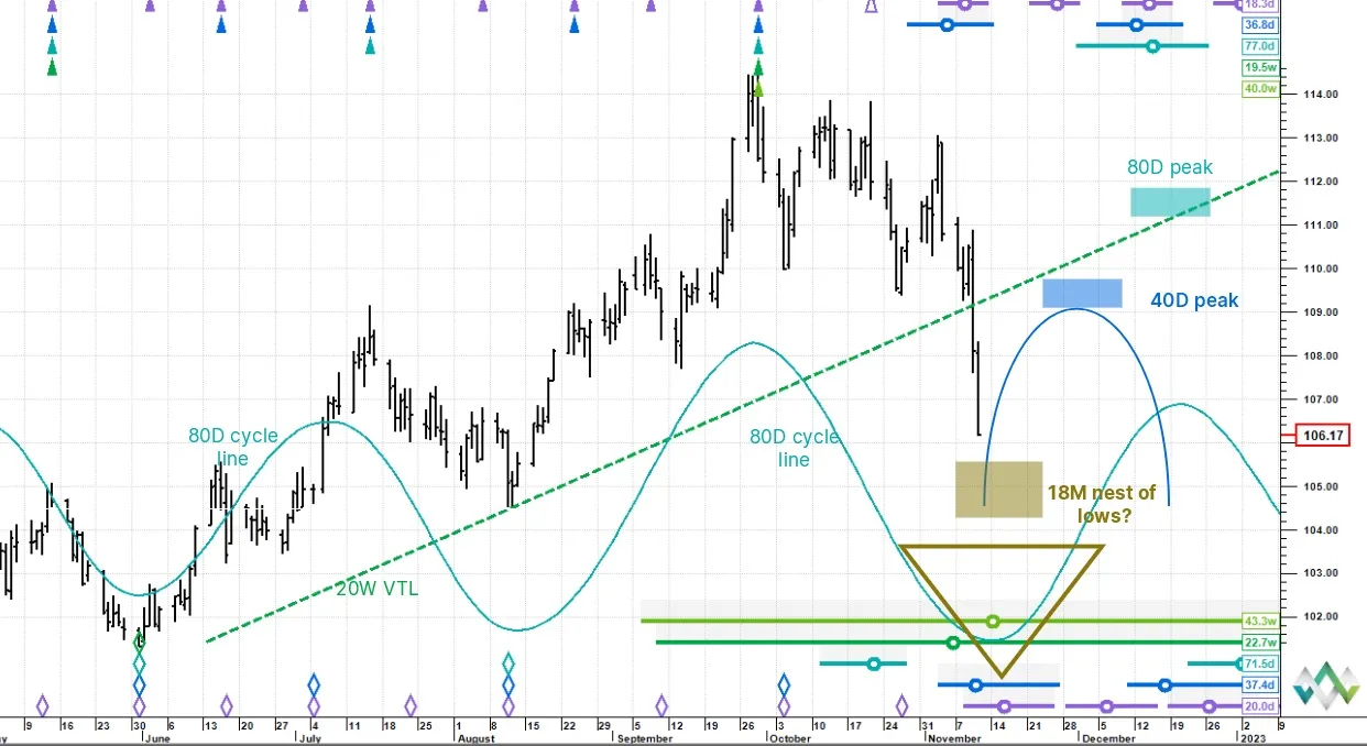 The direction of the US dollar (DXY) is a core macro driver at present and critical to crypto. Last week’s soft US CPI print saw DXY break down through our target zone. However, a cycle trough could now be at hand. The question is what is the magnitude of this bottom zone?