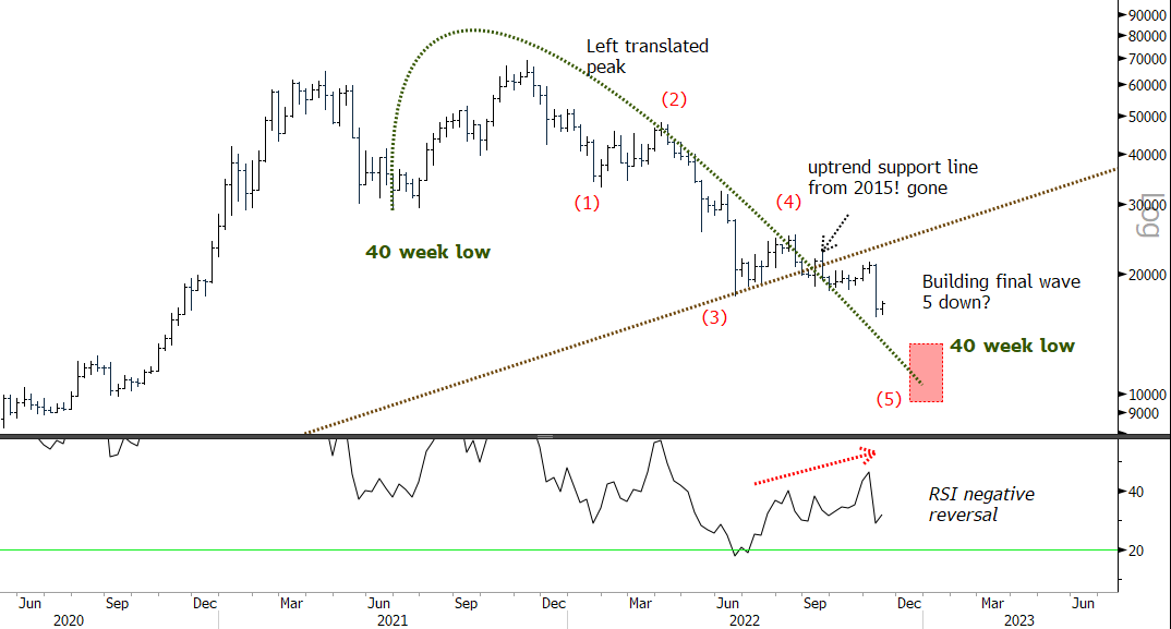 The Bitcoin weekly chart has lots of interesting elements that point to the sharp sell-off into the anticipated 18-month cycle low we were looking at yesterday – range US$10,000–14,000 expected from end December 2022 to end January/early February 2023.