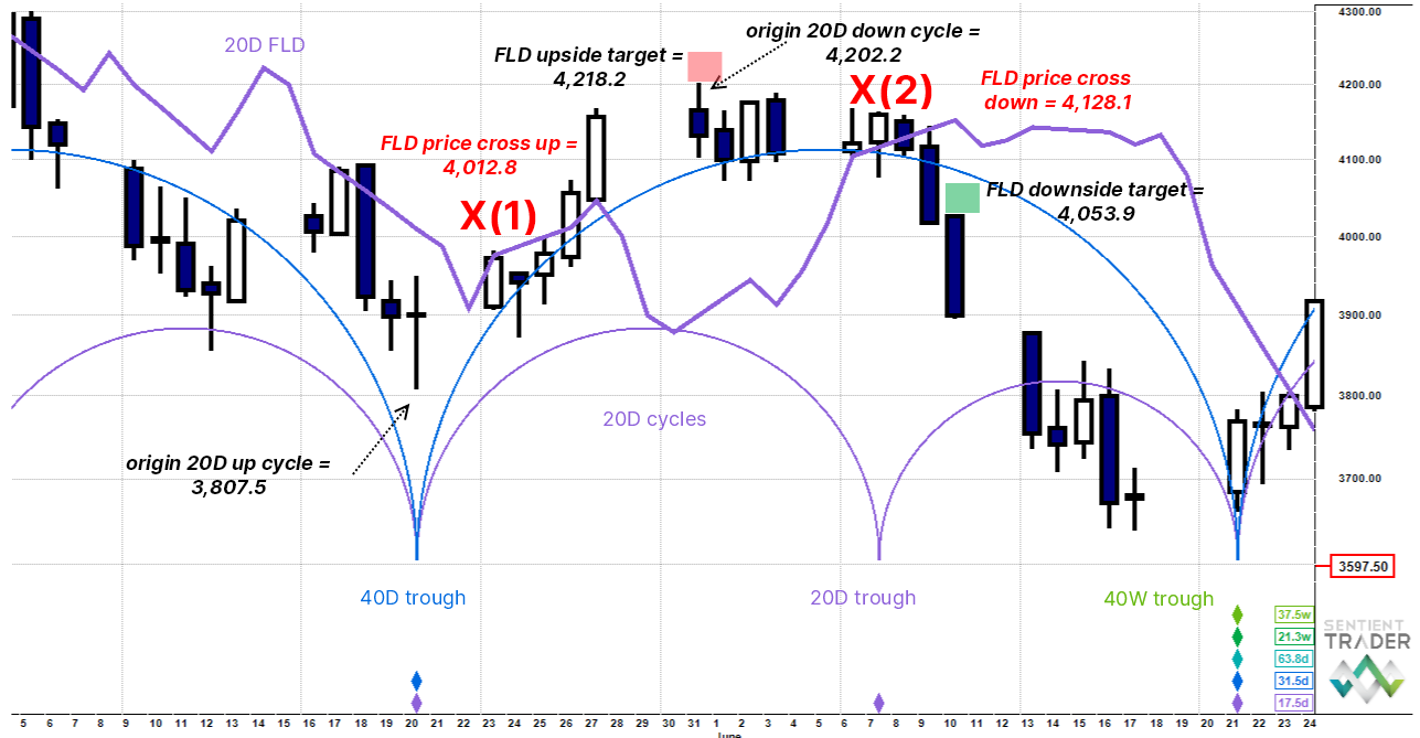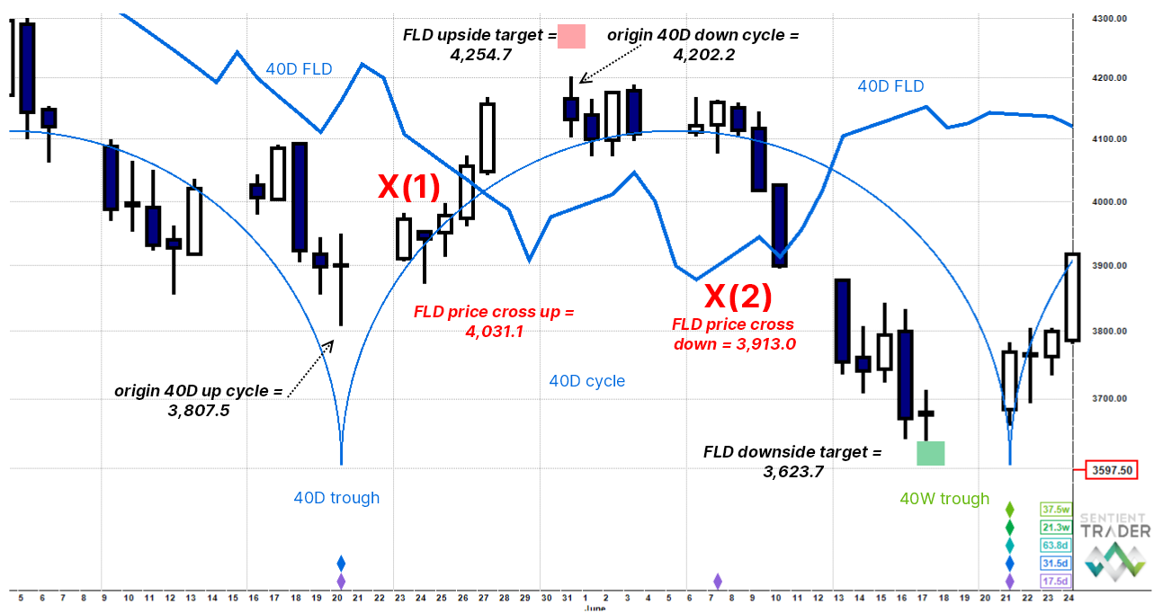 The origin price for the downside leg is the 4,202.2 top and prices fall to meet the rising 20 day FLD at 4,053.95 X(2). However this only generates a downside target estimate of 4,053.9, which is clearly way too short. In real time you would have expected a price overshoot to the downside because of the looming big trough and not just randomly closed out at X(2). You would have needed to step up to the next longer cycle 40 day FLD. So let’s look at that now.