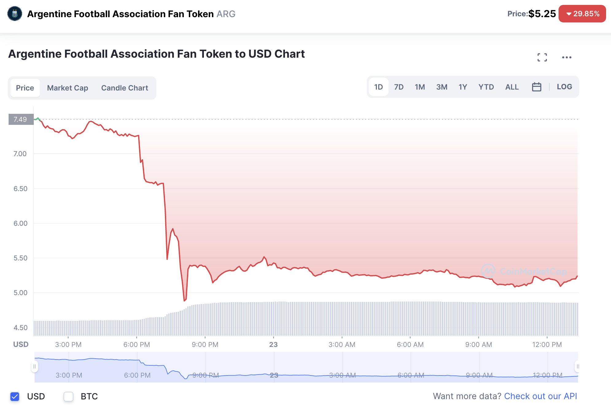 The shocking 2-1 loss triggered the $ARG token to fall to US$5.39 from highs of US$7.49 before kick off.