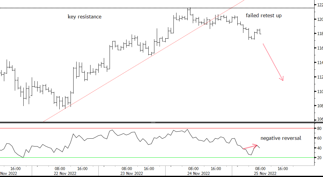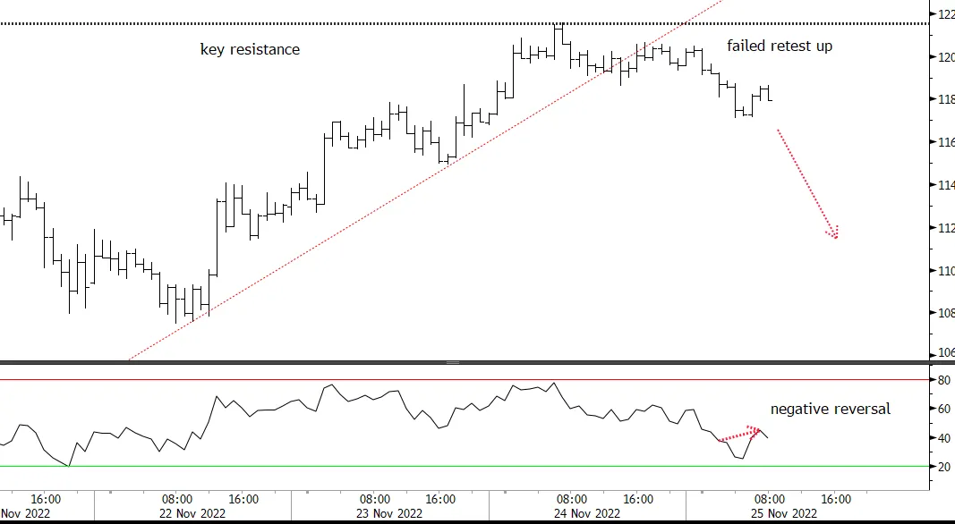 ETH was strongly rejected at key resistance yesterday and is starting to cascade lower. There has a been a failed retest higher and negative reversal in RSI (hourly) – price down, RSI up, poor ease of movement higher. Keep looking down near term.