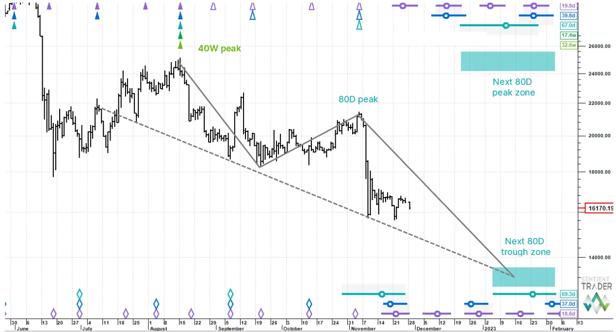 Because Bitcoin has event driven forces working in the background, the cycles analysis has been disrupted by fundamental price shocks. Typically when this happens, for example a big earnings surprise, a pandemic, a shock interest rate change and such like, the cycles get jolted but then fairly quickly resume their cadence.