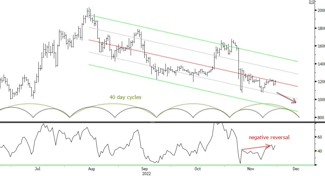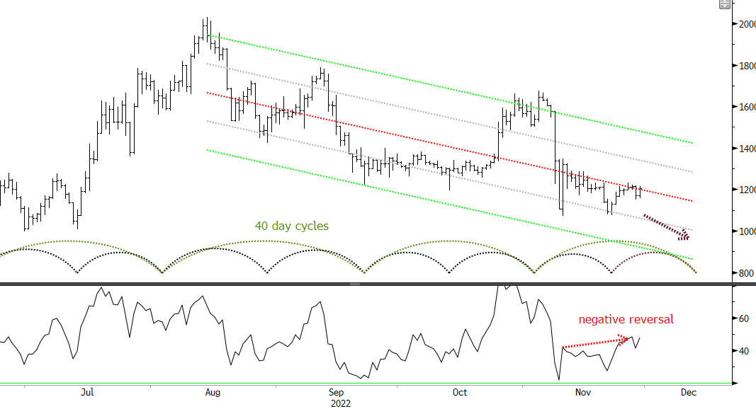 The trough isn’t until the end of December and in fact is likely to be pushed forward in time some (right translated in cycle speak). The cycles are falling hard and this is a burden on price.
