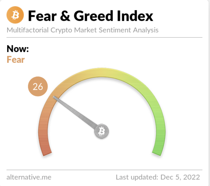 Risk appetites are sapped – the Crypto Fear and Greed Index currently stands at 26, indicating “ fear” – a sign that investors are skittish. The index uses 5-6 measurements to assess the current sentiment of the market and then rates that level of emotion on a scale of 1-100 – 1 is extreme fear and 100 is extreme greed.