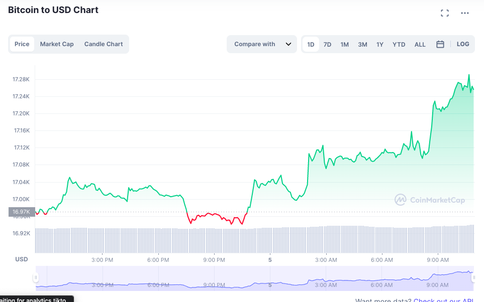 At the time of writing, Bitcoin (BTC) is trading at US$17,212,70 (+1.41%) while Ethereum (ETH) is trading at US$1,290.67 (+2.44%). Major altcoins such as BNB, Avalanche (AVAX), and Polkadot (DOT) have also been trading in green within the same period.