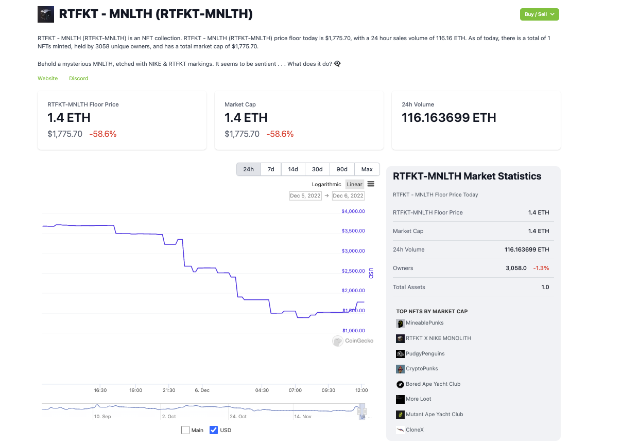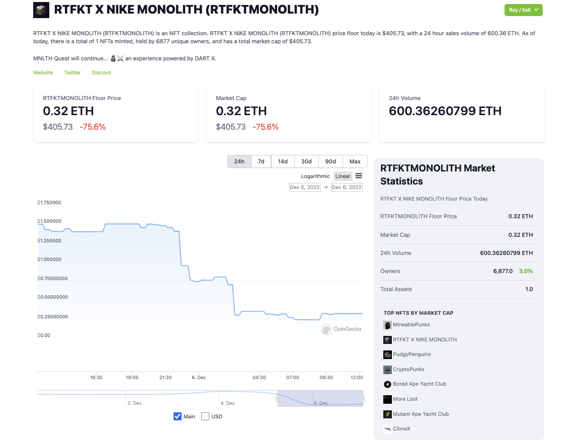 RTFKT-MNLTH and RTFKT x NIKE MONOLITH floor prices have tanked over 58% and 75% respectively since the reveal too.