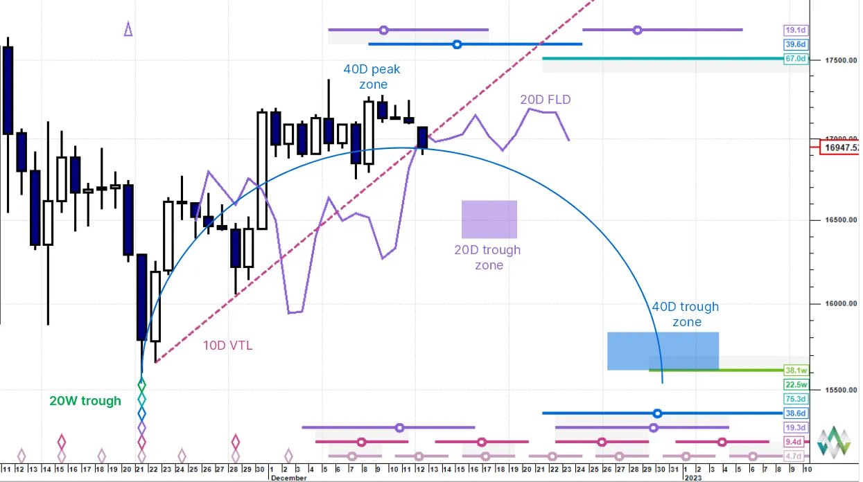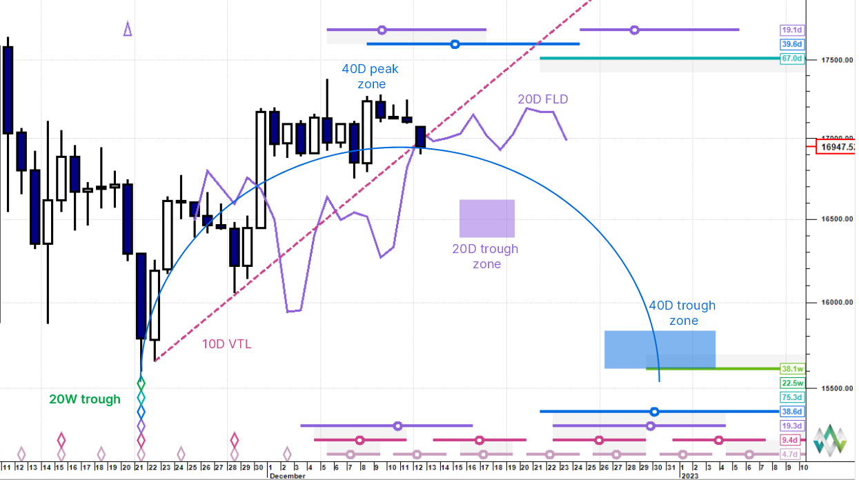 If price crosses cleanly down through the 20-day FLD (the purple offset 20 day cycle) then price then projects down to the 20-day cycle trough circa 17 to 20 December around 16,500. This in turn projects down to the 40-day cycle trough due at the end of the month around 15,700. One of the factors affecting Bitcoin’s bearishness now is the potential bottoming of the US Dollar, which looks to be passing through a 40-day cycle trough.
