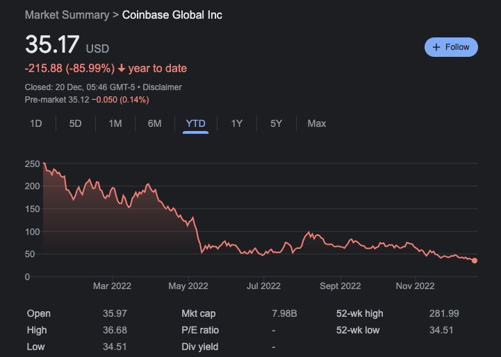 In comparison, Coinbase has a current market cap of just US$8 billion after its stock price collapsed 86% YTD, reaching its all time low on Monday of US$35.17.
