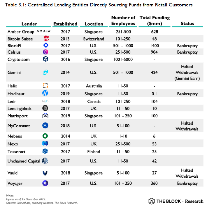 Of the 18 companies listed, 7 have either declared bankruptcy or have halted withdrawals. Singapore based-firms on the list include Amber Group, Crypto.com, Matrixport and Vauld.