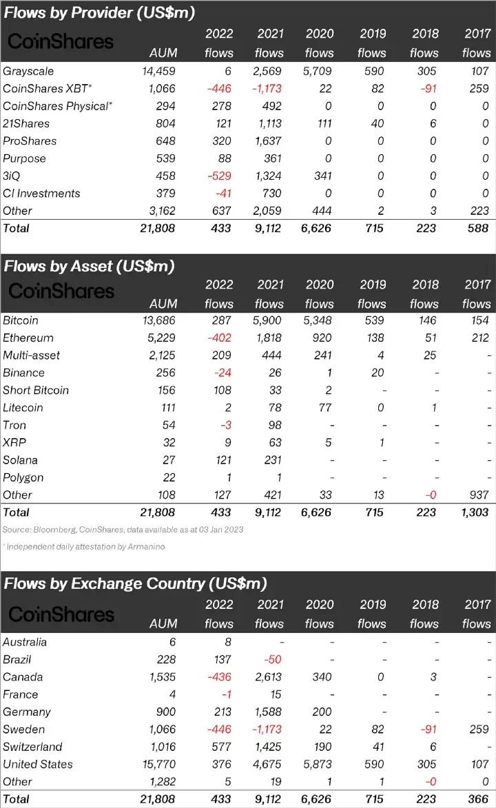 There were US$433 million entering crypto products last year, a 95% and 90% decrease from US$9.1 billion in 2021 and US$6.6 billion in 2020 respectively. However, the 2022 total was almost double the level seen during the 2018 bear market, which saw US$233 million flow into digital asset products, specifically exchange-traded products and investment instruments including Grayscale's Bitcoin Trust and Digital Asset ETPs from 21Shares.